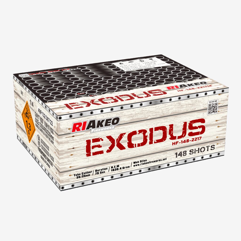 nDie Exodus von Riakeo ein kompaktes Verbundfeuerwerknn(148 Schuss geschossen im Kaliber 20/25mm als X Fächer und einer NEM von knapp 1,9kg)n n n Bukett-Effekte:n n nMit bunten Kometen und darauf folgenden diversen Effekten in schneller Schussfolge bis hin zum Goldfinale als Fächer mit Wirbelaufstieg.
