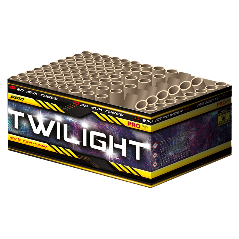 Pro-line Fireworks Twilight, 100 shots, 20+25mm compound. Gekleurde peony met snow-style crackling, gouden salvos met ghost-effecten, fan/z-shape effecten en double gold en enkel goud effecten vormen een ultieme opbouw van begin tot eind. n nProductinformatie: nType product: Siervuurwerk nEffect product: Compound nTube diameter: 20+25mm nFanshape: Ja nClassificatie: CAT.F2 nMinimale leeftijd: 16 jaar nLegaal afsteken op: 31 december nVeiligheidsafstand: minimaal 8 meter nGeschikt voor smalle straten: Nee nGeschikt in Gemeente vuurwerkverbod: Nee Twilight 100 shots 20+25mm Goedkoop vuurwerk kopen bij Vuurwerkwinkel Amersfoort